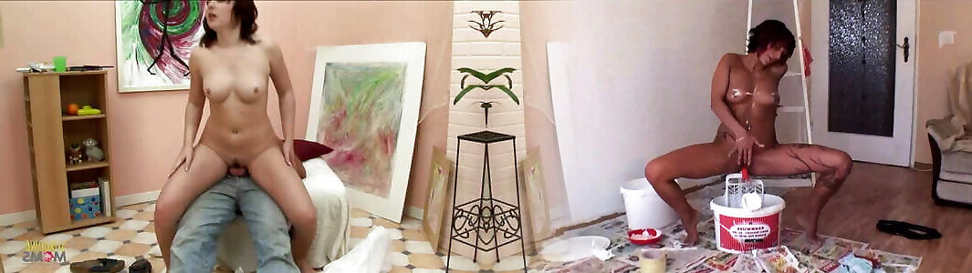 Painter gets to fuck his brunette hot teen fingering live after getting his dick sucked