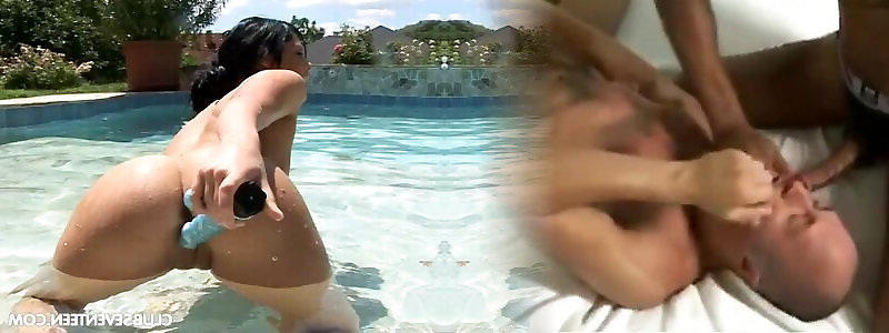 Playing with a blue faux-cock in the pool on a super-cute day