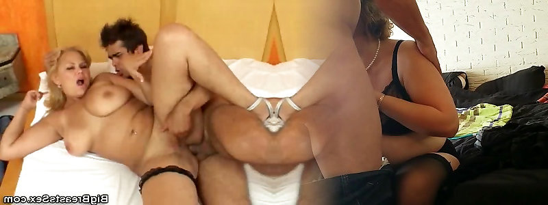 Big-chested ash-blonde grannie enjoys threesome pummeling