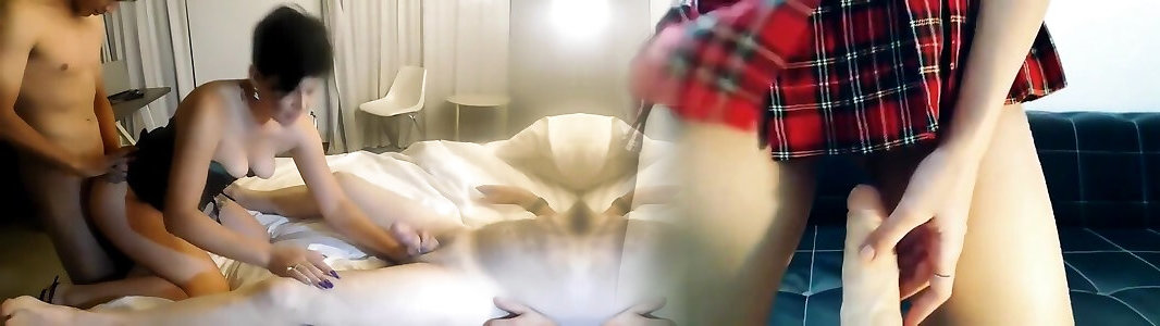 Attractive girl masturbates her boyfriend wearing black gloves and helps with her feet in socks
