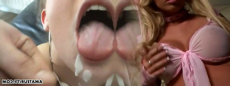 Bianca Pureheart in uniform drinks jizm in a ultra-cute MMF 3 way clamp