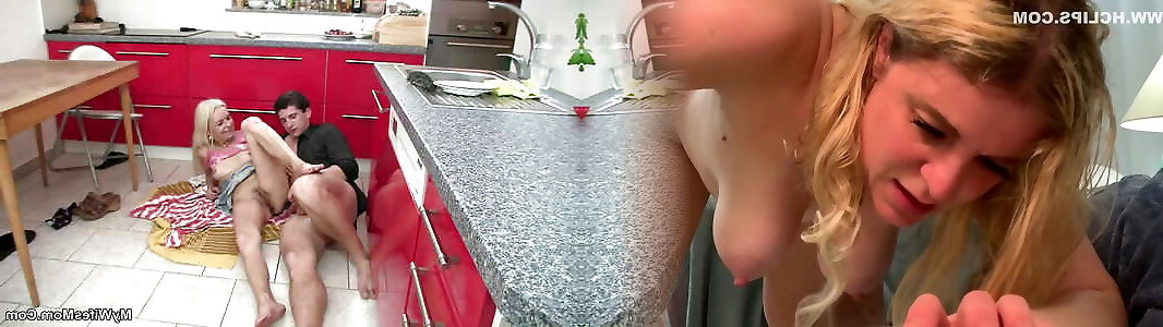 Hairy blonde mother-inlaw spreads legs on kitchen