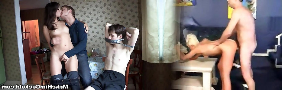 Ball-gagged and trussed up hotwife Beau watches ultra-kinky teen riding finest friend