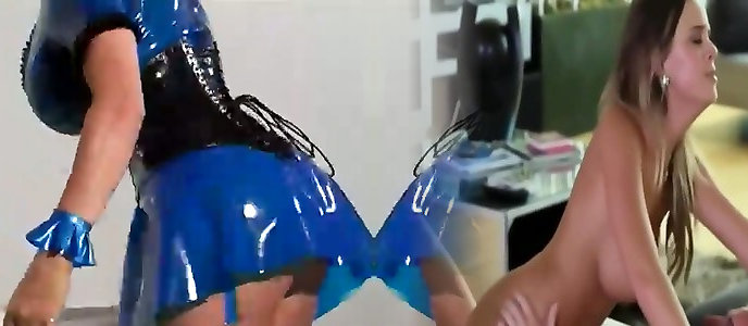 Super busty dark haired in cock-squeezing latex sundress bounds herself to the bed