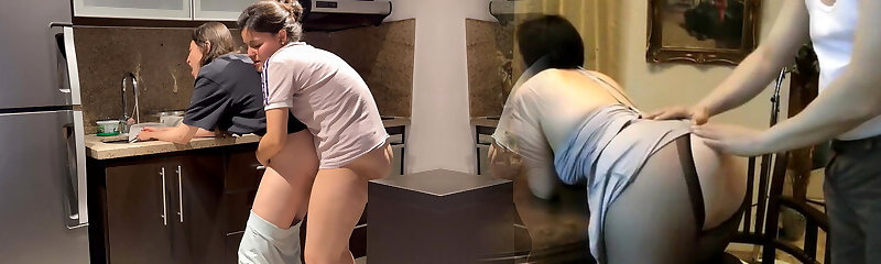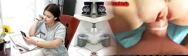 Wife banged hard with tongue while washing dishes in the kitchen, getting her to jizm before her stepmom gets home.