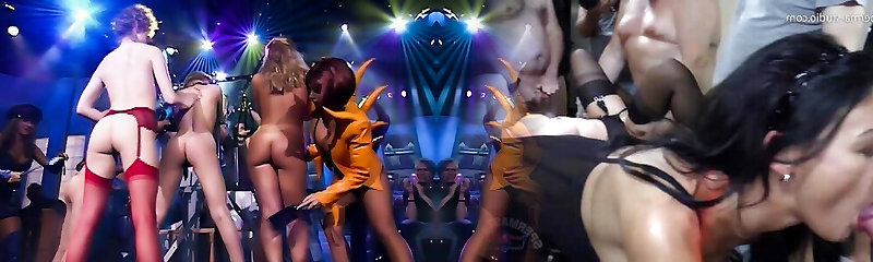 5 naughty girls playing with each other’s pussies and with hard schlong in group sex