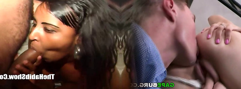 Dark Haired bi-atch is plowed rock-hard by 4 humungous dark-hued chisels