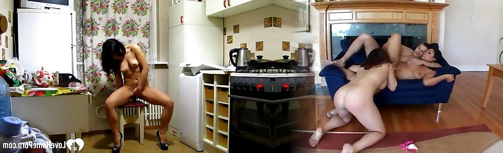 Two horny sluts use toys and take two cocks in living room