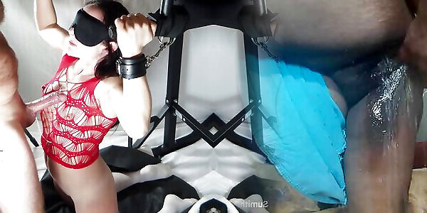 Manacled Domination & Submission Gimp Gets Panty Injection In Trio