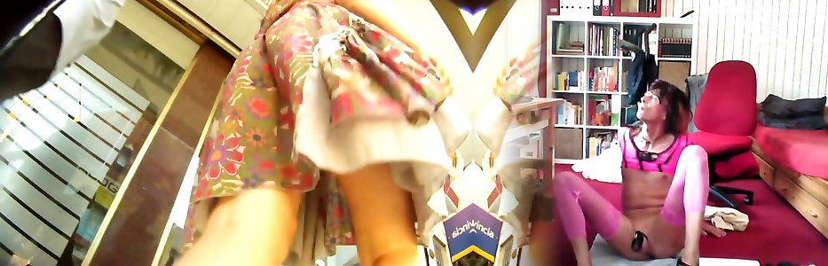 Doll in uber-cute dress lets the voyeur see spins cock under it