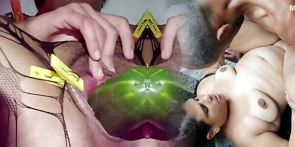 Stretched vaginal lips inserting a big cucumber and squirting