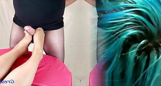 Hot blonde in fishnet pantyhose gives a Footjob a big dick POV