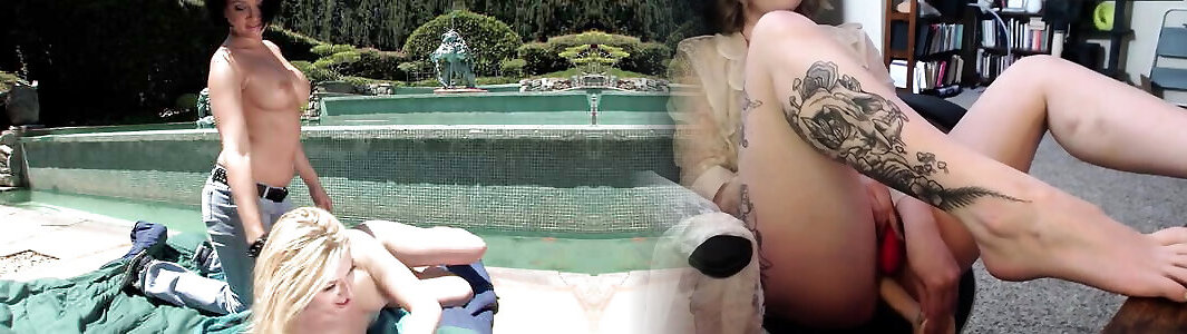 Horny blonde and brunette play with toys by the fountain then get double penetrated