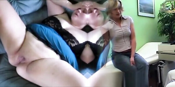 Chubby Mistress bends Him over to grab His balls and gives a rough Handjob