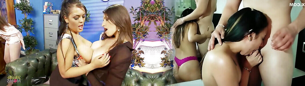 Horny boss having joy with trio fucksluts in the office