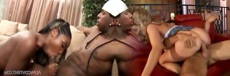 Blonde hot MILF Daphne Rosen pleasing two black cocks in the living room