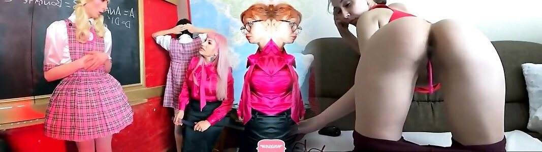 Cosplaying lesbos take advantage of the new blonde by beginning a 3some filled with eating ass and scissoring